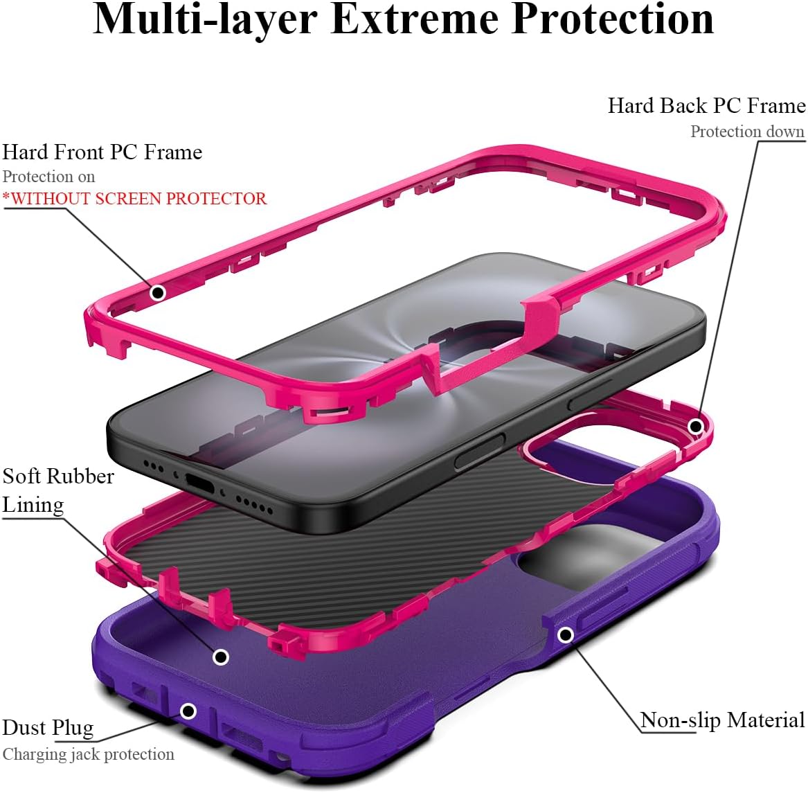 - 【3 in 1 Design】Adopting detachable 3 in 1 design, all-around protection from the outside to the inside (without built-in screen protector). case for iPhone 16 is made of hard PC inner and soft TPU silicone outer material. In addition, the surface is added with port covers keep out dust and debris, precision non-slip diagonal stripes and frosted finish makes it easy to grip.